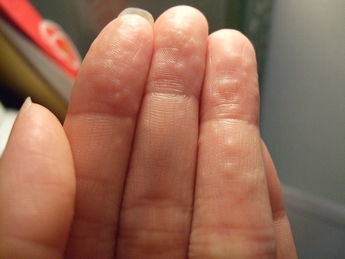 好吧~這是手指頭最新近況..難看得要命~像蛇一樣嚴重脫皮!但是還沒有好啊!我的手很乾沒錯!因為醫生叫我不能用肥皂、不要用酒精、而我的乳液都有香料啊....所以都不敢抹!(泣!!)